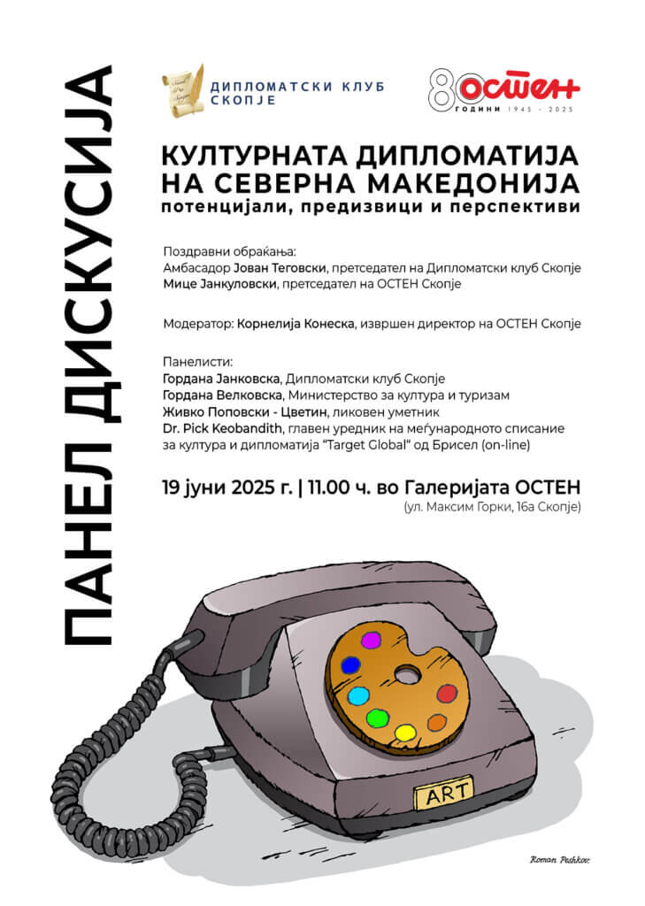 Дипломатскиот клуб Скопје и Установата од културата за музејска и галериска дејност ОСТЕН АРТ Скопје имаат чест и задоволство да Ве поканат на панел дискусијата “Културната дипломатија на Северна Македонија: потенцијали, предизвици и перспективи“ којашто ќе се одржи на 19 јуни 2025 г. со почеток во 11.00 ч. во Галеријата ОСТЕН. ул. Максим Горки 16а, Скопје (програма во прилог).